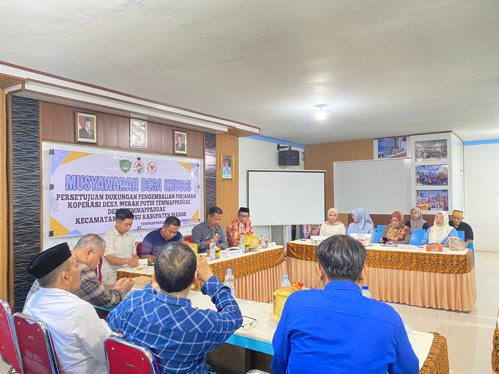 Temmappaduae, Maros – Pemerintah Desa Temmappaduae, Kecamatan Marusu, Kabupaten Maros, menggelar Musyawarah Desa (Musdes) khusus pada Jumat, 07 November 2025, di Aula Kantor Desa Temmappaduae. Agenda utama musyawarah ini adalah Persetujuan Dukungan Pengembalian Pinjaman Koperasi Desa Merah Putih. Kegiatan ini dihadiri oleh unsur pemerintah desa, perwakilan kecamatan, serta lembaga terkait. Musyawarah dipimpin langsung oleh Kepala Desa Temmappaduae, dengan kehadiran Kasi Pemberdayaan Masyarakat Desa Kecamatan Marusu yang mewakili Camat Marusu, Pendamping Business Assistant Koperasi Desa Merah Putih (KDMP) Kecamatan Marusu, Ketua BPD Desa Temmappaduae, serta Ketua dan pengurus Koperasi Desa Temmappaduae. Dalam sambutannya, Kepala Desa Temmappaduae menekankan pentingnya musyawarah sebagai wujud transparansi dan tanggung jawab bersama dalam pengelolaan keuangan dan aset desa, terutama yang berkaitan dengan pinjaman koperasi. "Koperasi Desa adalah milik kita bersama. Segala bentuk pengelolaan dan pengembalian pinjaman harus melalui kesepakatan bersama agar tidak menimbulkan kesalahpahaman di masyarakat," ujarnya. Kasi Pemberdayaan Masyarakat Desa, mewakili Camat Marusu, menegaskan dukungan penuh pemerintah kecamatan terhadap langkah-langkah transparan yang ditempuh oleh Desa Temmappaduae. Ia mengapresiasi peran aktif koperasi dalam mendukung perekonomian masyarakat desa. "Koperasi adalah pilar ekonomi kerakyatan. Dukungan pemerintah desa dalam memastikan pengembalian pinjaman yang tertib adalah bentuk tanggung jawab sosial dan ekonomi," katanya. Pendamping Business Assistant KDMP Kecamatan Marusu memberikan penjelasan teknis mengenai mekanisme pengembalian pinjaman serta strategi penguatan kelembagaan koperasi agar lebih sehat secara administrasi dan keuangan. Ia juga menekankan pentingnya disiplin dalam pelaporan dan evaluasi kegiatan koperasi secara berkala. Ketua BPD Desa Temmappaduae menyatakan bahwa lembaganya siap mendukung keputusan hasil musyawarah selama mengacu pada aturan dan kepentingan masyarakat. "BPD akan terus mengawal hasil musyawarah ini agar benar-benar dijalankan dengan baik dan sesuai kesepakatan bersama," tuturnya. Setelah melalui diskusi dan penyampaian pendapat dari peserta musyawarah, disepakati bahwa pemerintah desa memberikan dukungan resmi terhadap rencana pengembalian pinjaman Koperasi Desa Merah Putih, dengan mekanisme yang akan diawasi secara bersama oleh pihak desa, BPD, dan pendamping koperasi. Kegiatan musyawarah ditutup dengan penandatanganan berita acara sebagai bentuk kesepakatan bersama antar pihak yang hadir. Dengan terselenggaranya Musyawarah Desa ini, diharapkan pengelolaan Koperasi Desa Merah Putih ke depan semakin transparan, akuntabel, dan mampu meningkatkan kesejahteraan masyarakat Desa Temmappaduae.